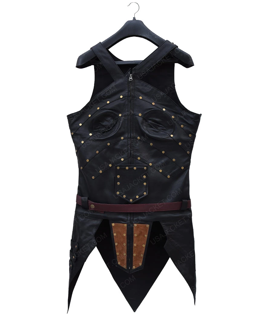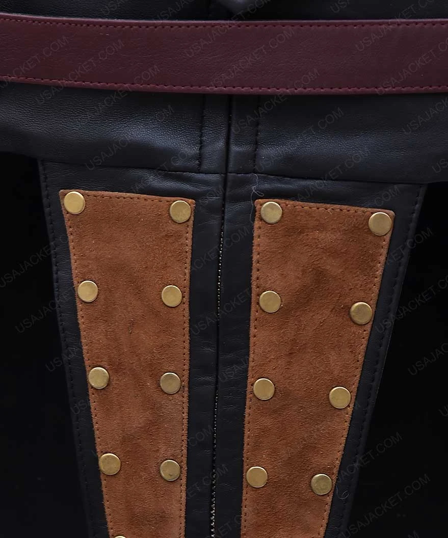 PU leather is the material that the Antiope Justice League Robin Wright Black Leather Corset. Along with the outfit, you will be getting the protection pieces that help you complete the costume. The pieces include the knee guards and gauntlets. The corset has front zip closure and is colored in black with golden studs.