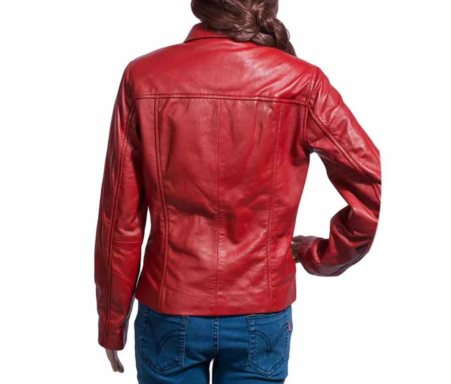 Once Upon A Time Red Jacket is made of top quality real leather along with viscose lining inside for a comfy wearing experience. The jacket has open hem cuffs with four outside zip pockets and full front zip closure. This outfit is superior for ladies who always want to have attractive personality.