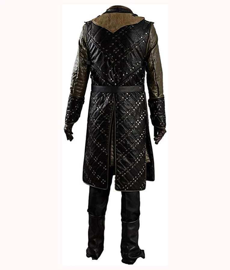 The real leather exterior of the Jon Snow Game Of Thrones Season 7 Kit Harington Armor Costume is made in two pieces. The first piece is a long sleeves coat that is fastened with a button closure and the second is a sleeveless coat that is a pullover style and fastened with a belt, both made from leather. The whole costume is available in black and brown colors.