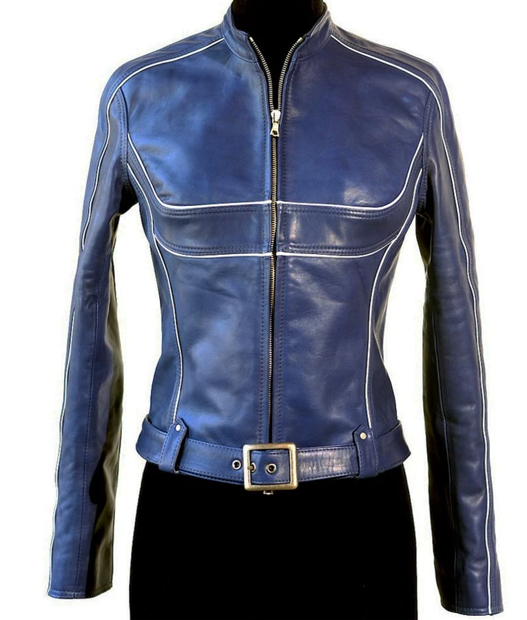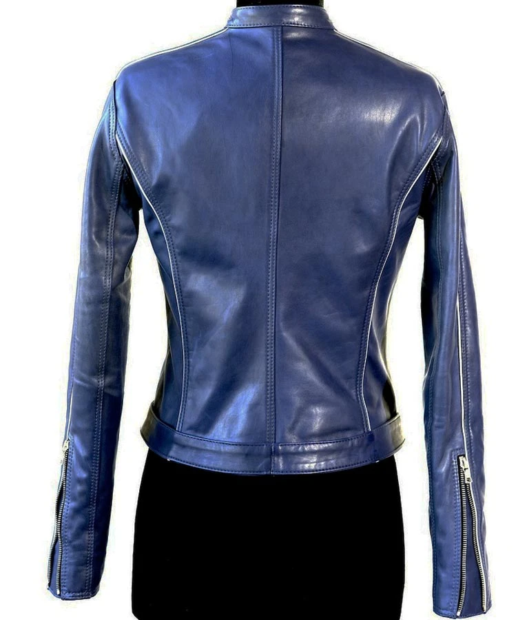 Once Upon a Time Blue Jacket is crafted in PU leather, includes viscose lining and hemline on borders for excellence. It also highlights stand-up collar, front zip closing, buckled belt with straps at hemline, white piping detail at chest and full sleeves with zipper cuffs.