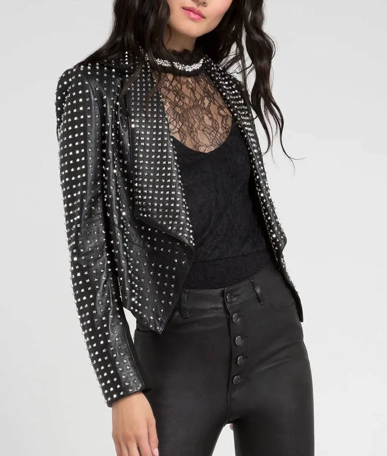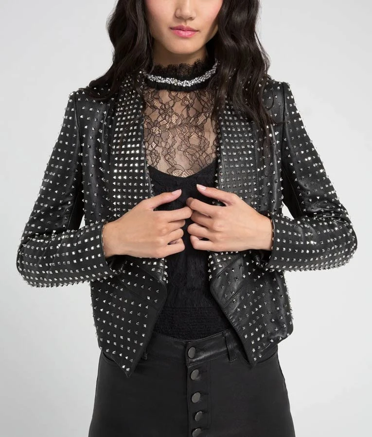 RHOBH Kyle Richards Studded Leather Jacket has a stylish internal viscose lining, and lapel style collar, with open front style, and open hem cuffs, along with two side pockets, and black color. The outfit is now available at our store for you to order and try this at your upcoming get together. Don’t wait when you can order it now. Order it now before it is out of stock.