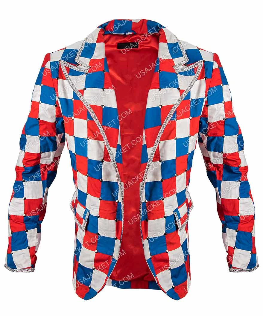 The Elton John Rocketman Taron Egerton Checked Colorful Blazer is just as the name suggests. It comes in the colors of the American flag, red, white, and blue. They are in a checked pattern to make it more stylish and fancy for any special occasion where the colors are required. There are pockets on the outside and inside with an open front style.