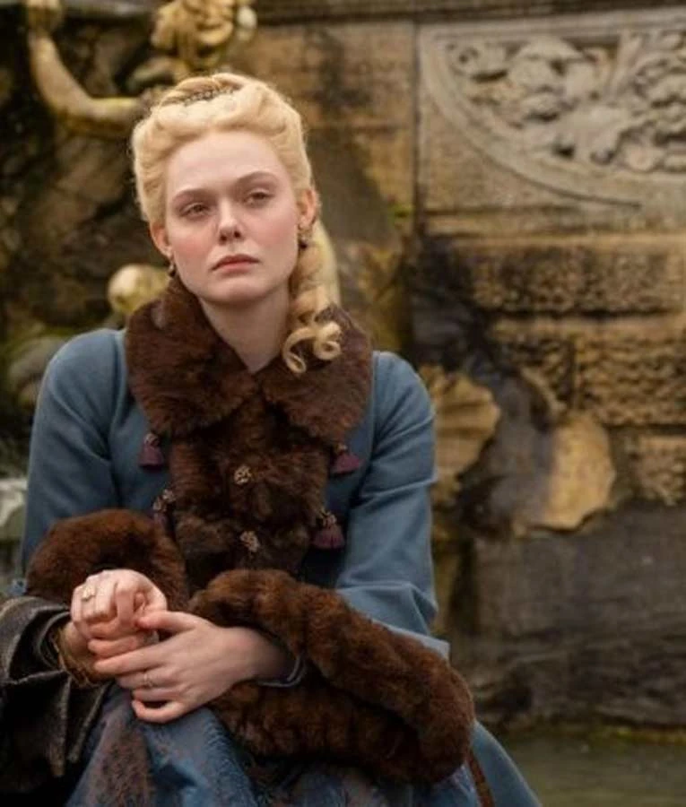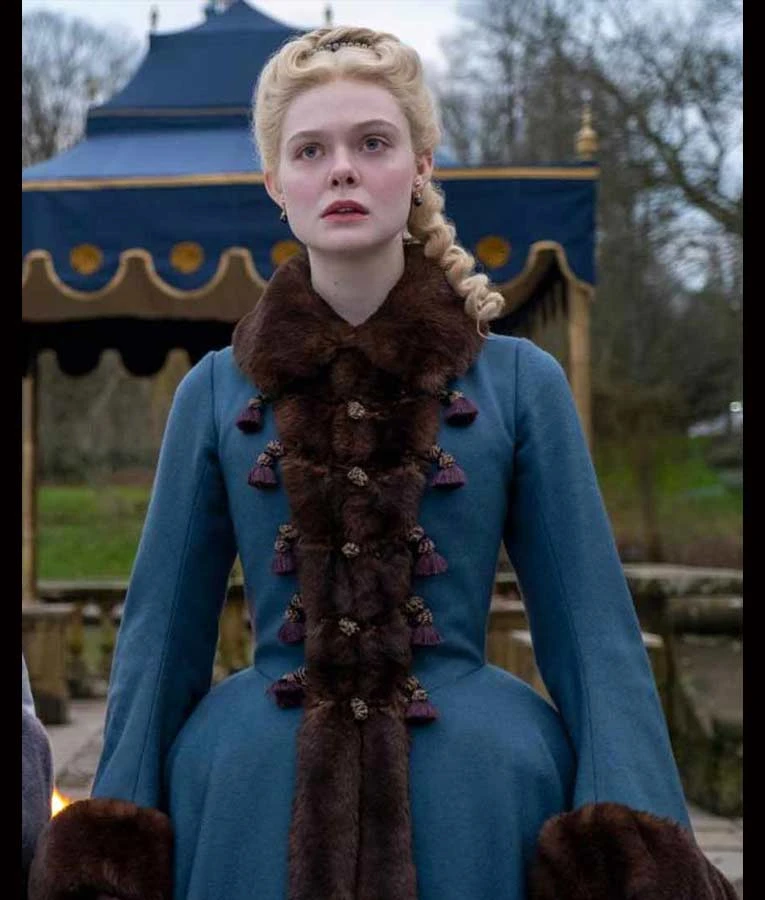 Catherine The Great Elle Fanning Blue Coat With Faux Fur Trim