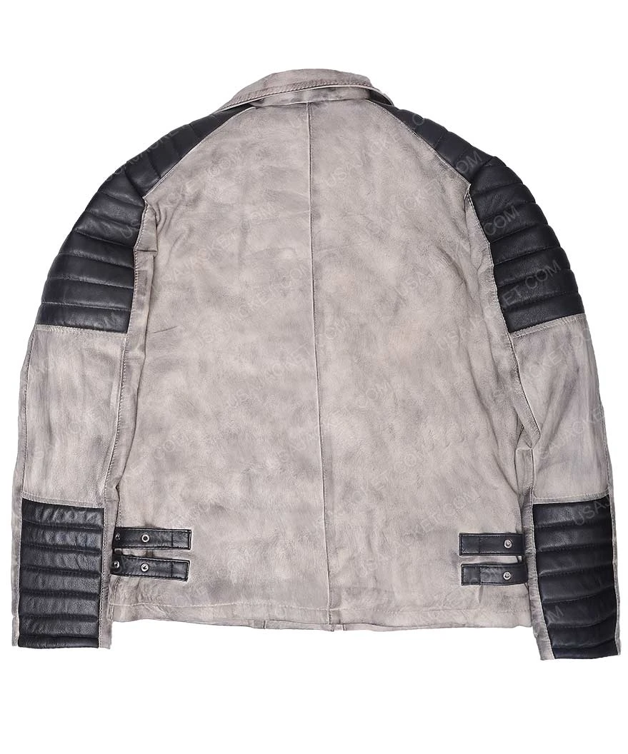 The Walking Dead Rosita Espinoza Leather Jacket has been crafted in genuine leather, including inner comfy material. This attire contains lapel collar, asymmetrical zipper closure, black padded patches on shoulders, black lining pocket on left side on waist, zipper pocket on left side of chest, long sleeves with zipper cuffs and hemline on bottom. This apparel is dirty grey in color.