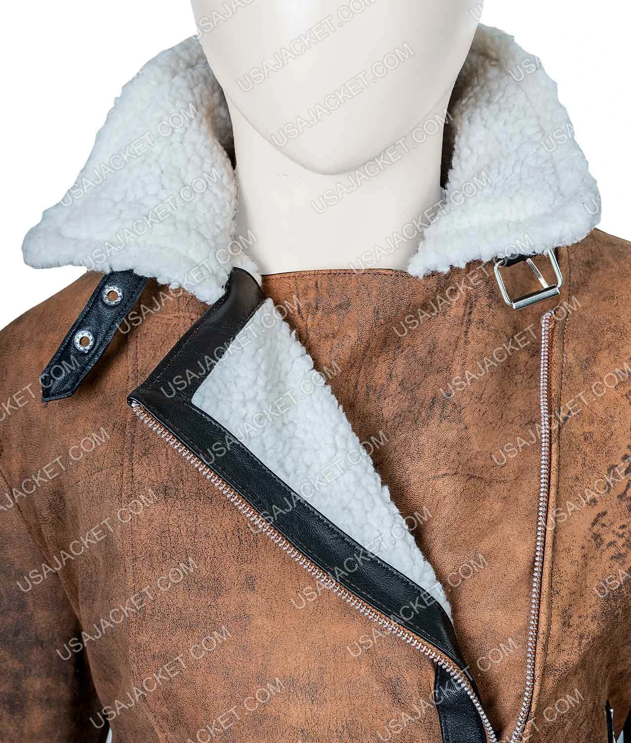 The jacket is completely made of Sheepskin Leather with black leather trimming on the edges. The inside of this Melinda Monroe Jacket is prepared with shearling lining. There are four zipped pockets (two on each side of the jacket) that provide you enough places to hold your stuff with you. The jacket is styled with asymmetrical style zip closure with zipped cuffs and padding on the sleeves. The collar of the jacket has a belt so incase if you want to style it as a flight jacket. This jacket is all ready to give you the most fashionable look you desire.
