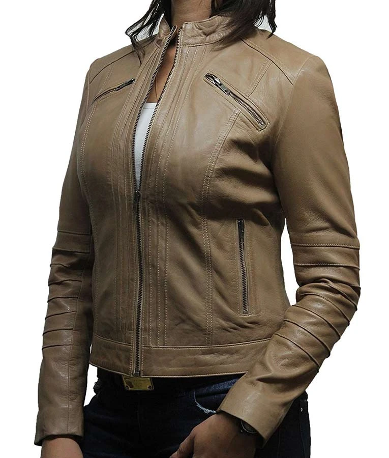 Womens Four Pockets Café Racer Style Beige Biker Leather Jacket
