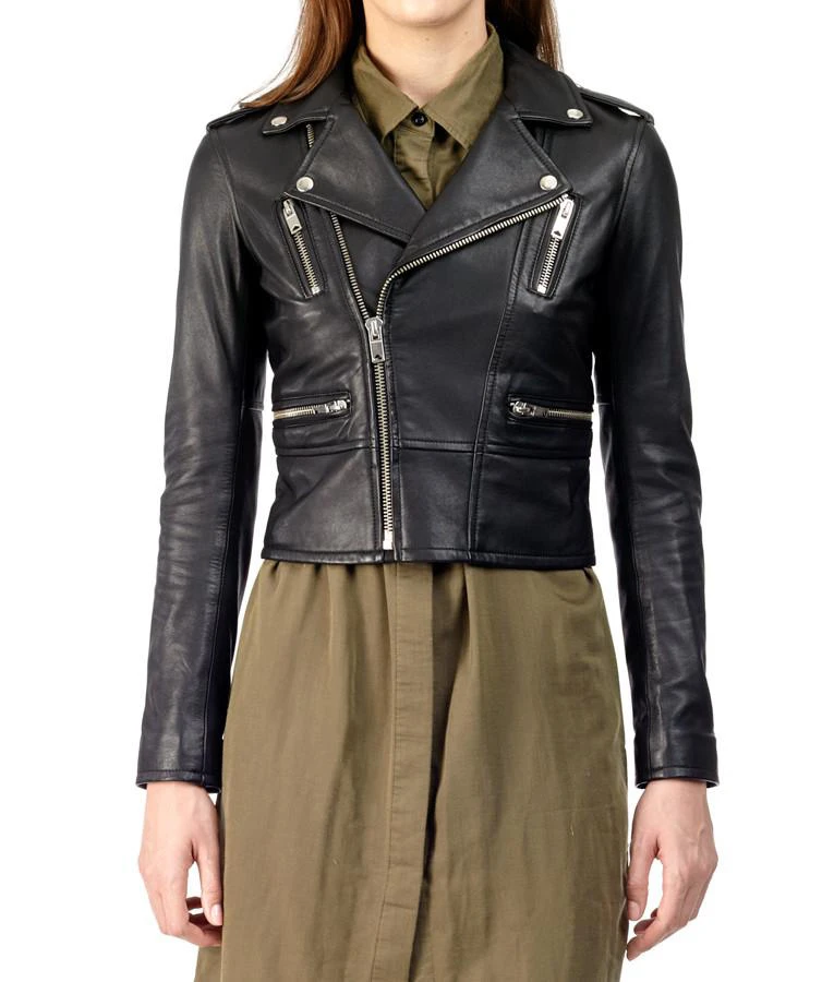 100% Genuine Lambskin leather is used in the overall creation of this attire along with soft viscose lining keep you relaxed. Its features include asymmetrical zip closure so that you can attire Womens Biker Cropped Jacket easily plus it has full sleeves with zipped cuffs that provide you the ideal fitting. The designing embraces quality stitching, epaulets on the shoulder, and four zipped functional pockets constructed for your easiness.