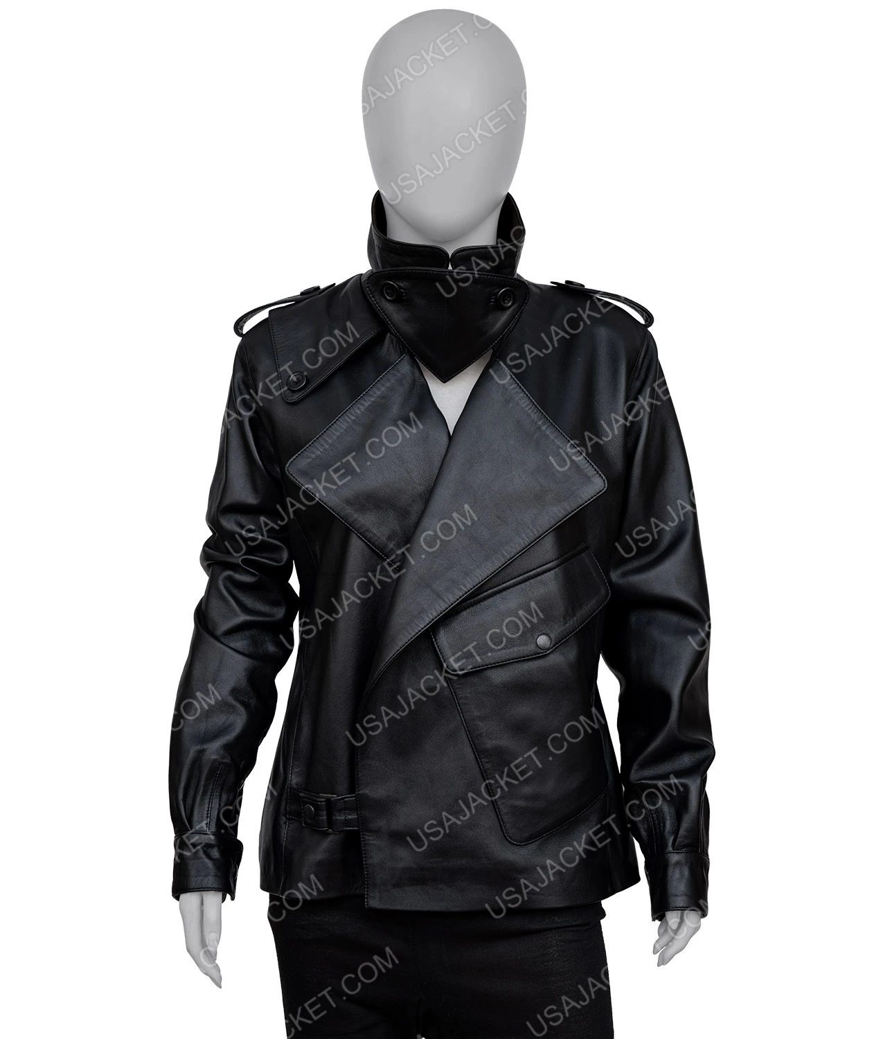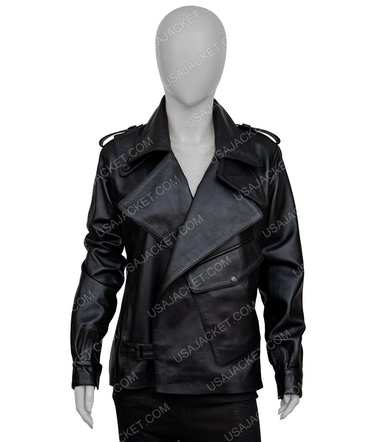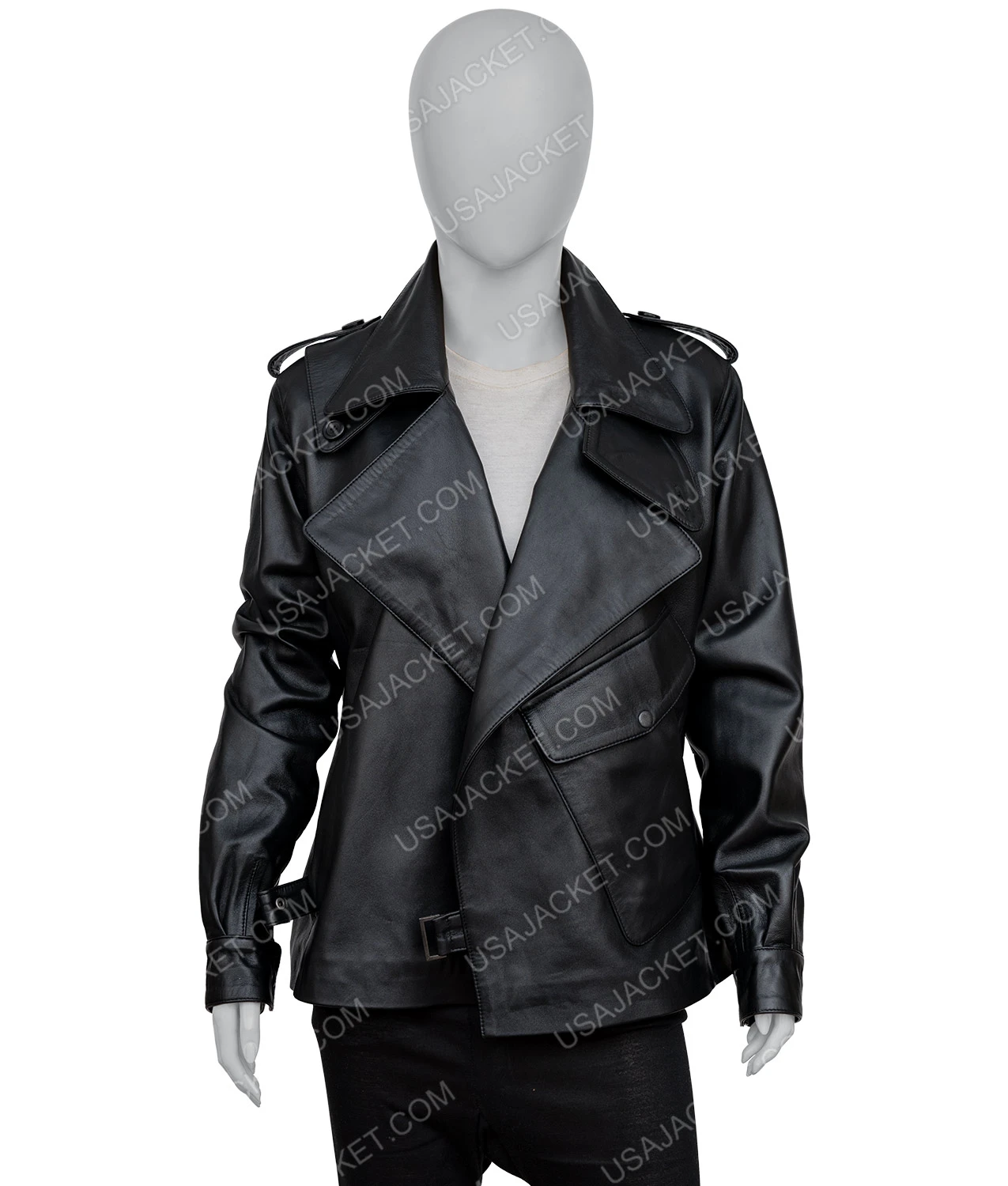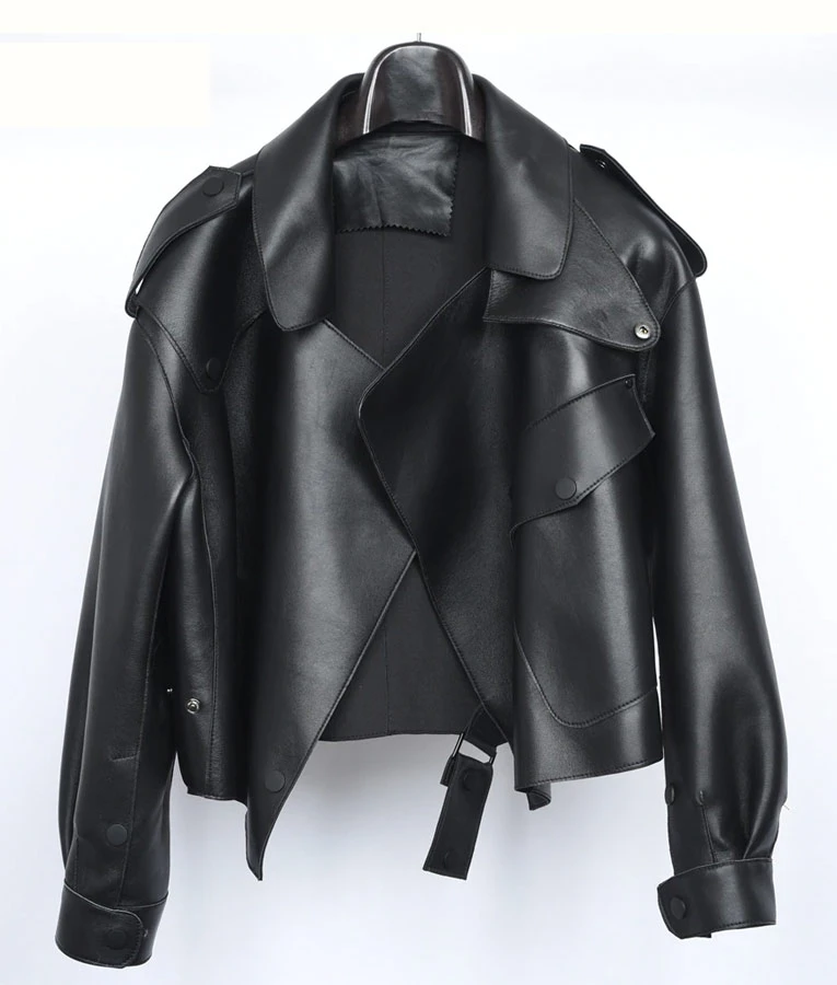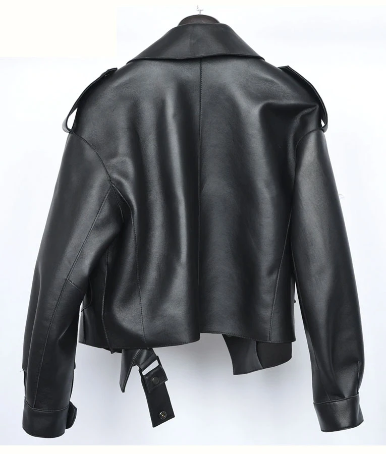 This Womens Spring Sheepskin Leather Jacket is composed of sheepskin leather; this leather is luxuriously light, warm, and stylish. The inner is cover with soft and smooth viscose lining, which gives you comfort and soft touch. The notch collar is present on the jacket and the asymmetrical belted closure so you can adjust it according to your body shape — full sleeves with classic button cuffs, which provides you with an edgy and eye-catching look. The jacket has one left side big flapped button pocket given so you can easily carry your essentials with you. The jacket offered in four colors black, grey, white, and red, so you have a diverse choice which one you want to pick and suits on you and gives you an attractive look. On the shoulder straps with button are present which enhance the beauty of the jacket.
